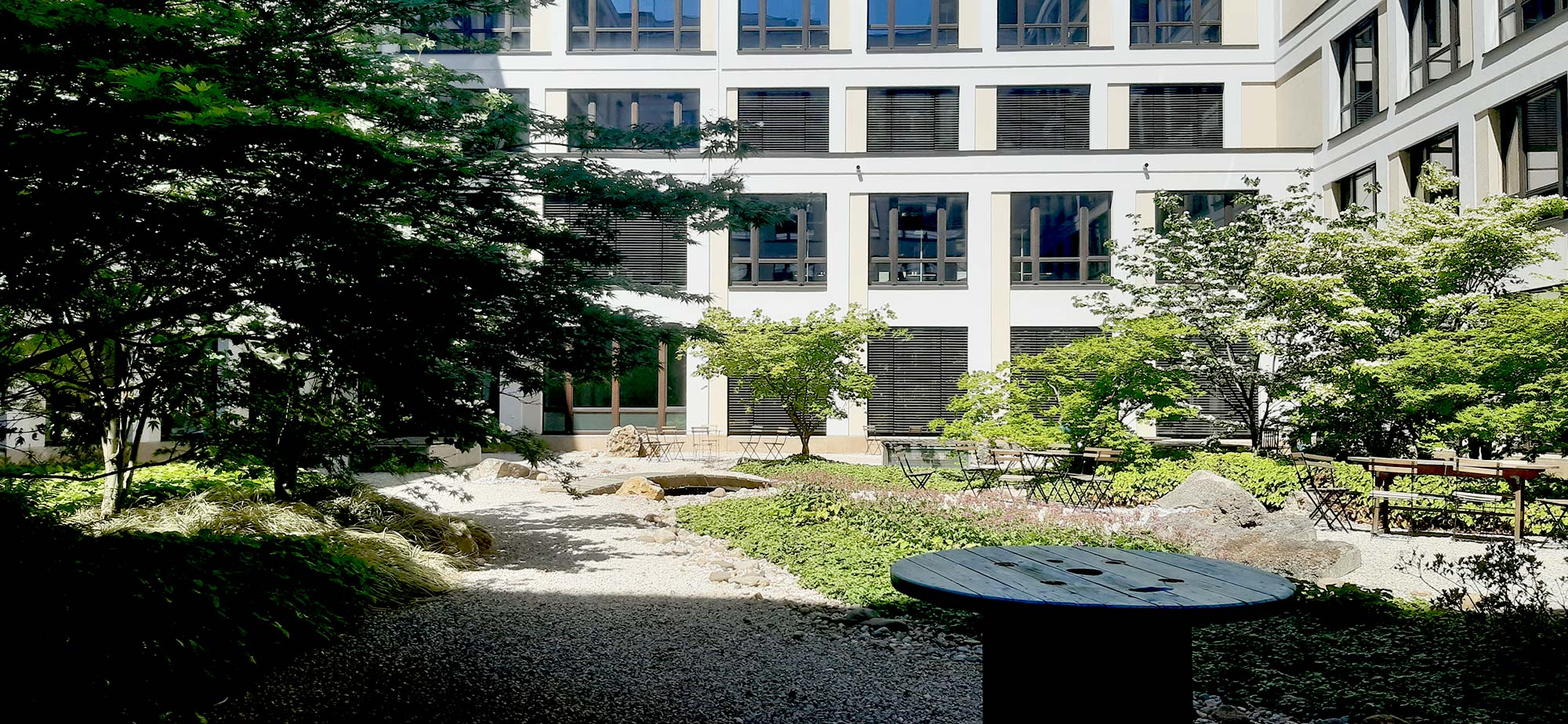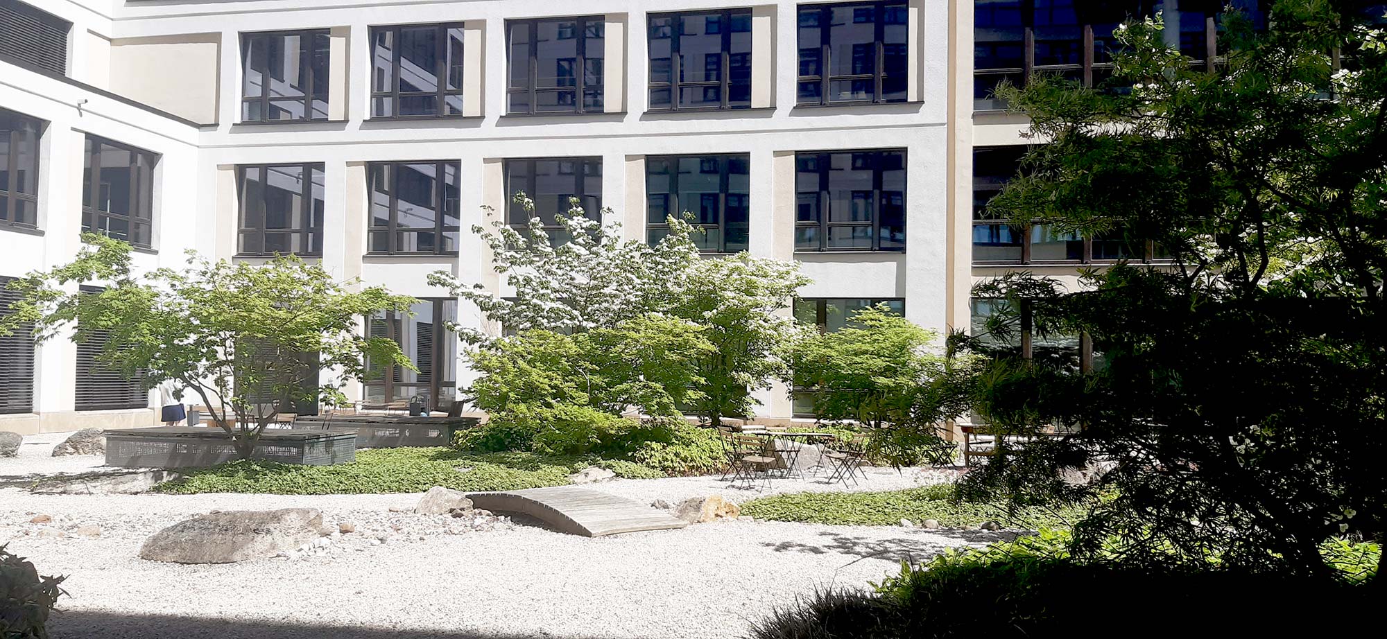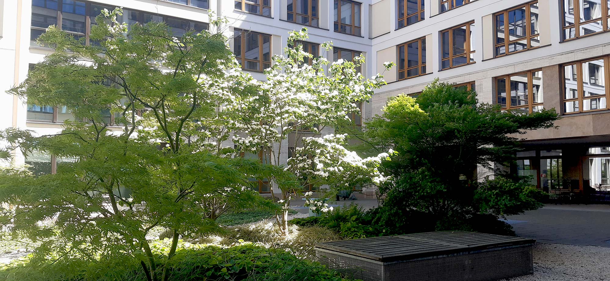 Der Garten auf dem unterbauten Gartenhof der Mercedes-Zentrale in Berlin steht beispielhaft für moderne Landschaftsgestaltung im Themenbereich der Dachbe-grünung. Mittlerweile hat unser Büro zahlreiche kleine und große Dachflächen gestaltet. Bei Interesse sprechen Sie uns an.“
