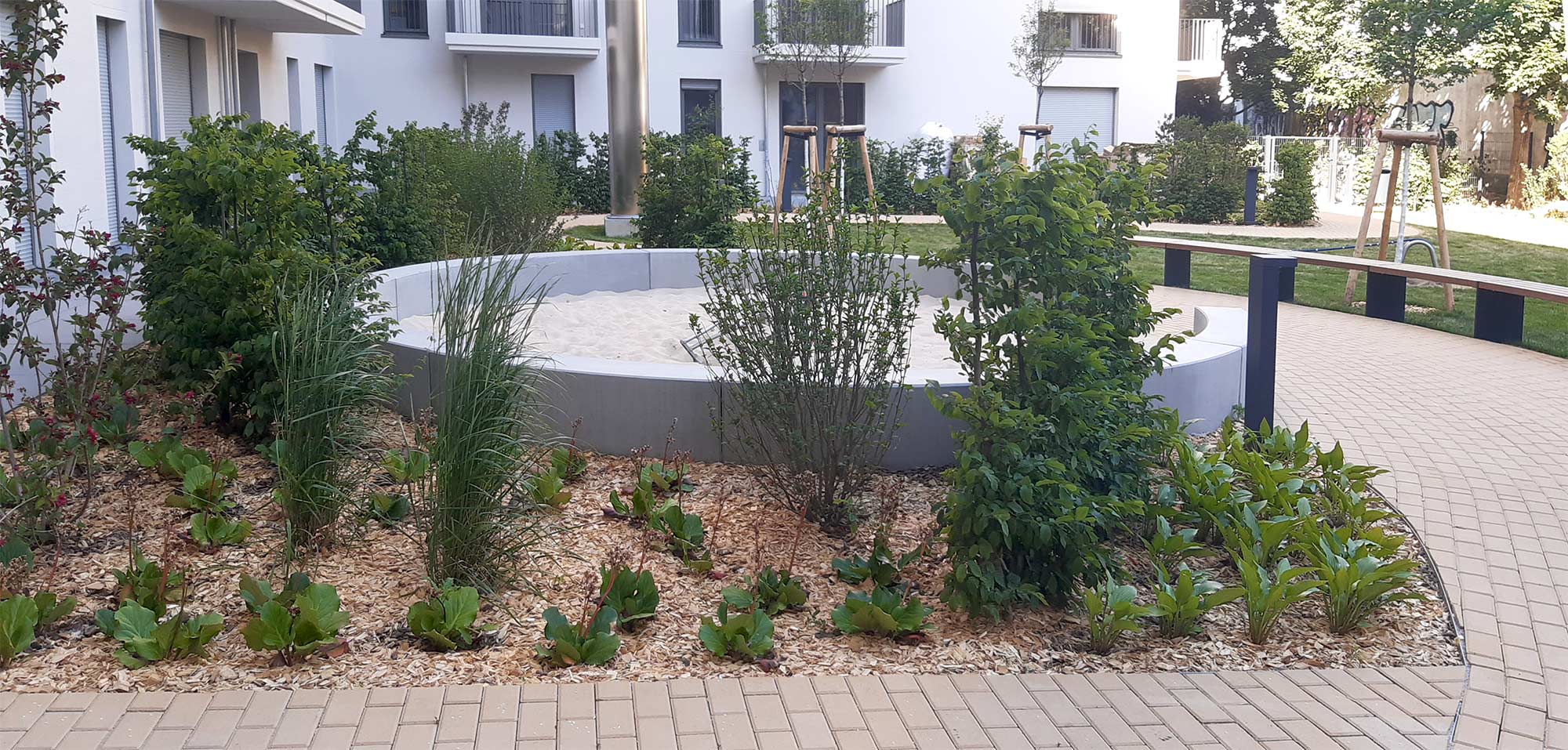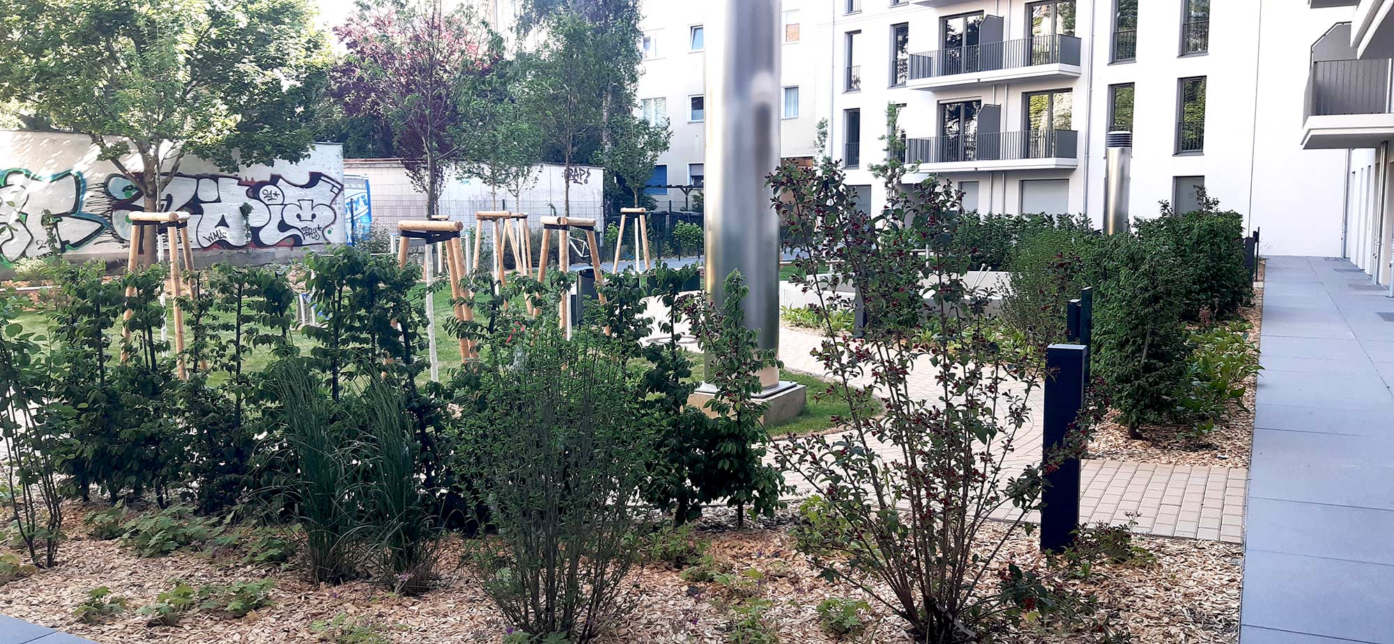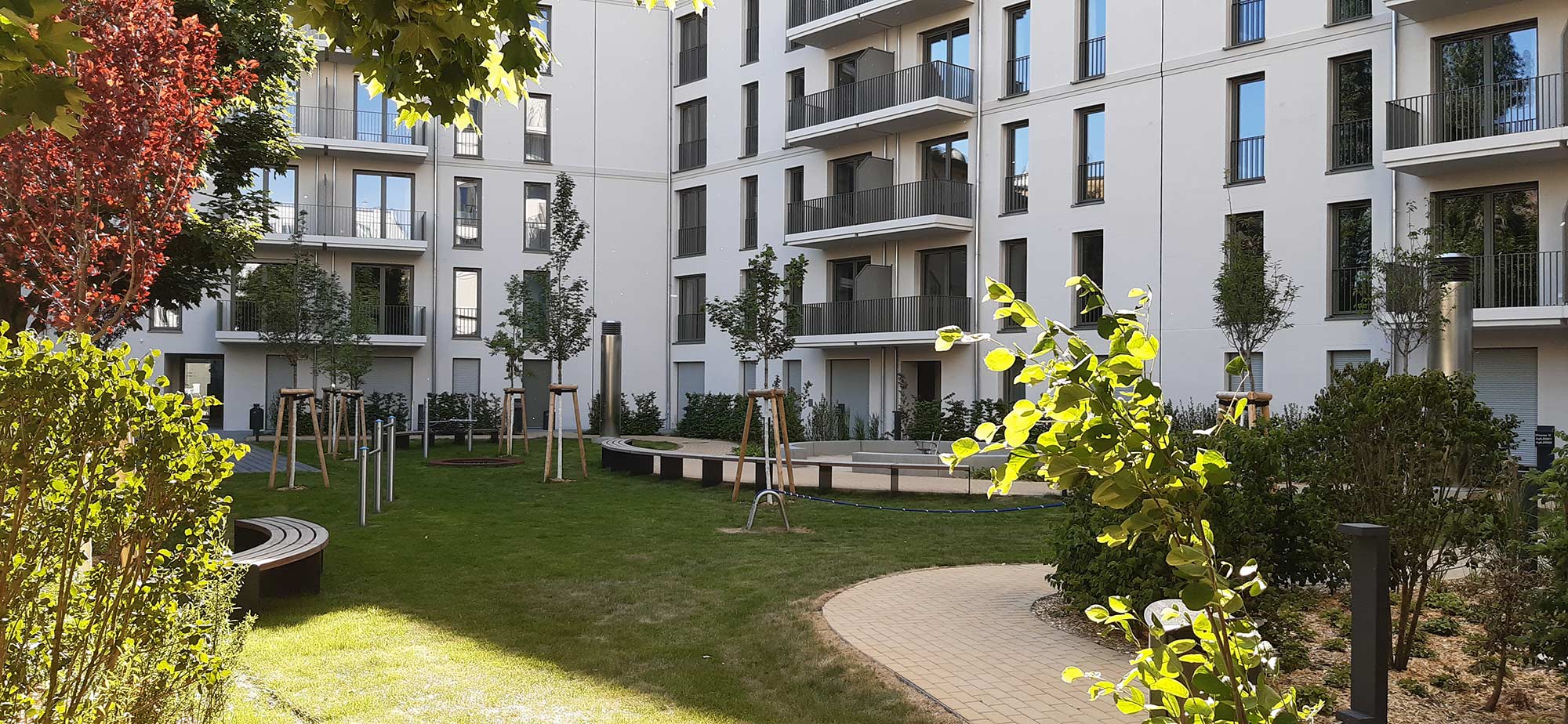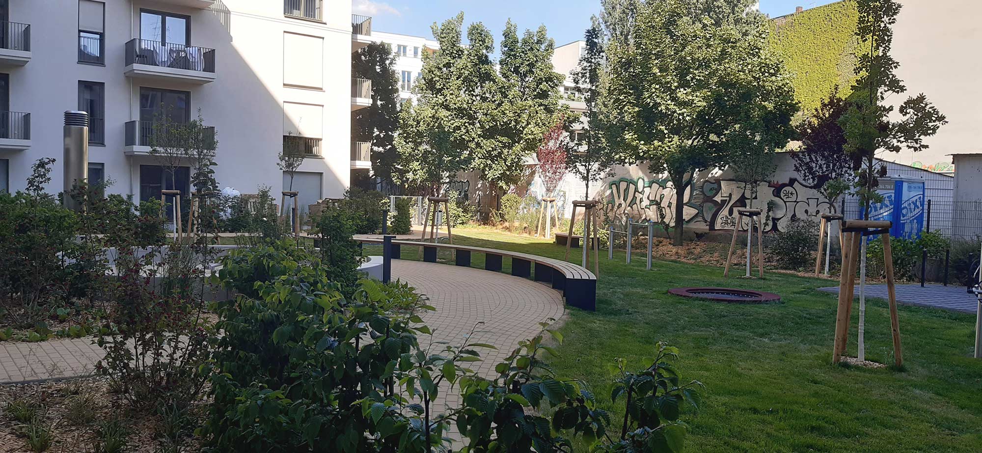 Bezahlbares studentisches Wohnen in Microappartements ist ein Thema unserer Zeit. In Neukölln ist eine solche Wohnanlage mit begrüntem Innenhof erschaffen worden. Die Bewohner können sich im Garten treffen, feiern und austauschen. Farbenfrohe Pflanzen umsäumen die mit geschwungenen Wegen eingefasste Rasen- und Spielfläche.